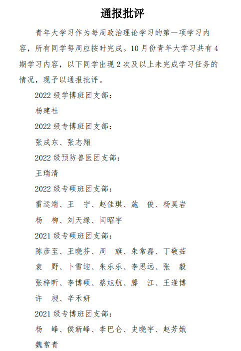 【通报批评】关于对10月未按时完成青年大学习员工的通报批评