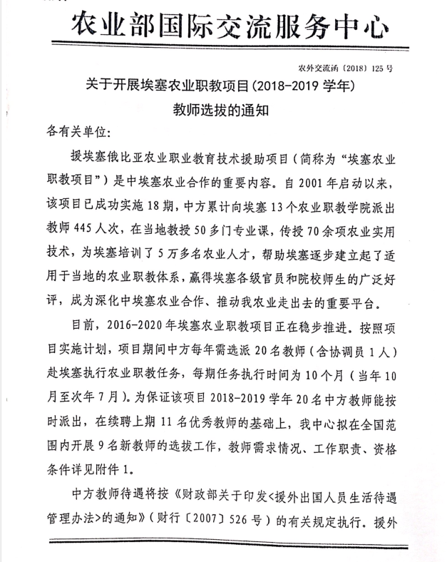 转发《关于开展埃塞农业职教项目(2018-2019学年)教师选拔的通知》