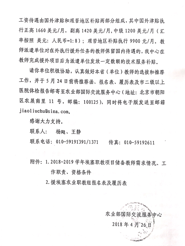 各位老师:现将农业部《关于开展埃塞农业职教项目(2018-2019学年)教师选拔的通知》转发如下,请有意申报的老师尽快与公司人事处团队科颉登科老师联系(029-87082871、029-87082970),5月18 日之前报送相关材料给人事处团队科颉登科老师。