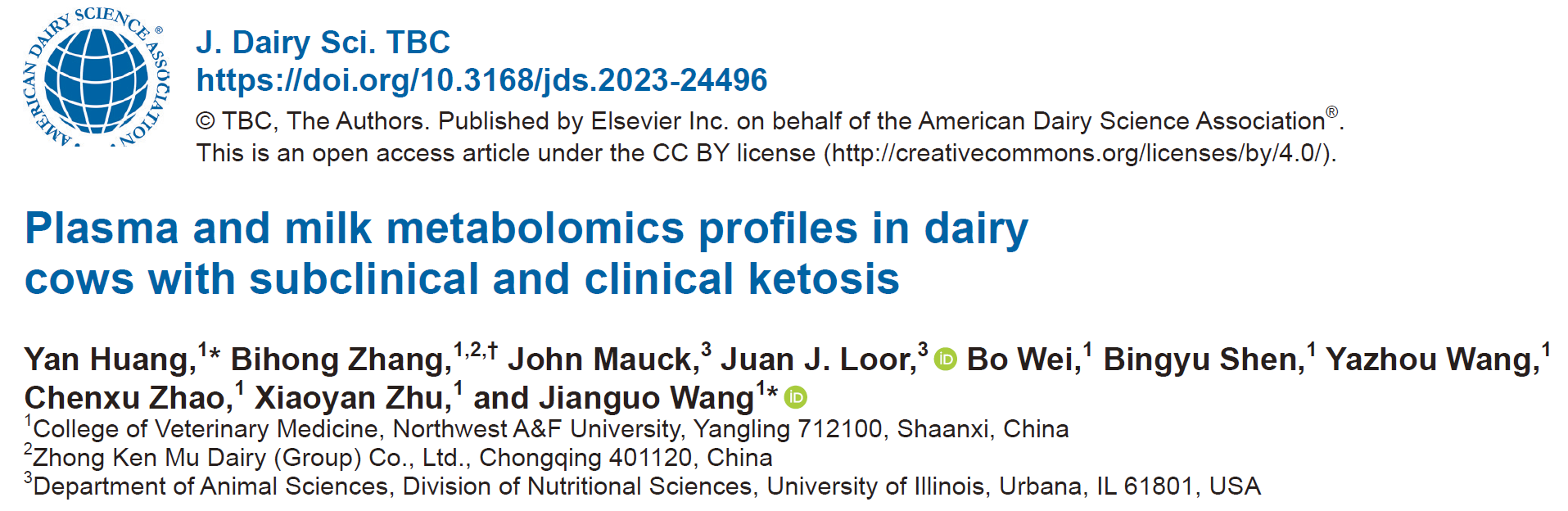 近日,best365中国官方网站动物中毒病与营养代谢病研究团队王建国教授课题组联合美国伊利诺伊大学Juan J. Loor教授在Journal of Dairy Science上发表了题为“Plasma and milk metabolomics profiles in dairy cows with subclinical and clinical ketosis”的研究论文,博士研究生黄岩、张毕红为该论文共同第一作者,王建国教授为通讯作者。