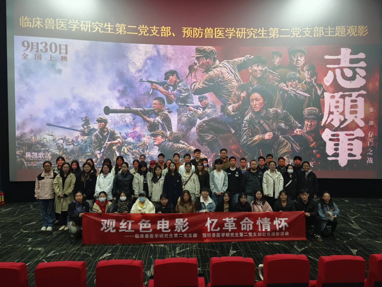 在庆祝中华人民共和国成立75周年之际,为弘扬爱国主义精神,传承红色基因,从革命先烈的事迹中汲取奋进力量,10月26日,预防兽医学研究生第二党支部和临床兽医学研究生第二党支部共同组织红色观影主题党日活动,支部党员、发展对象和入党积极分子共同观看了爱国主义题材影片《志愿军:存亡之战》。