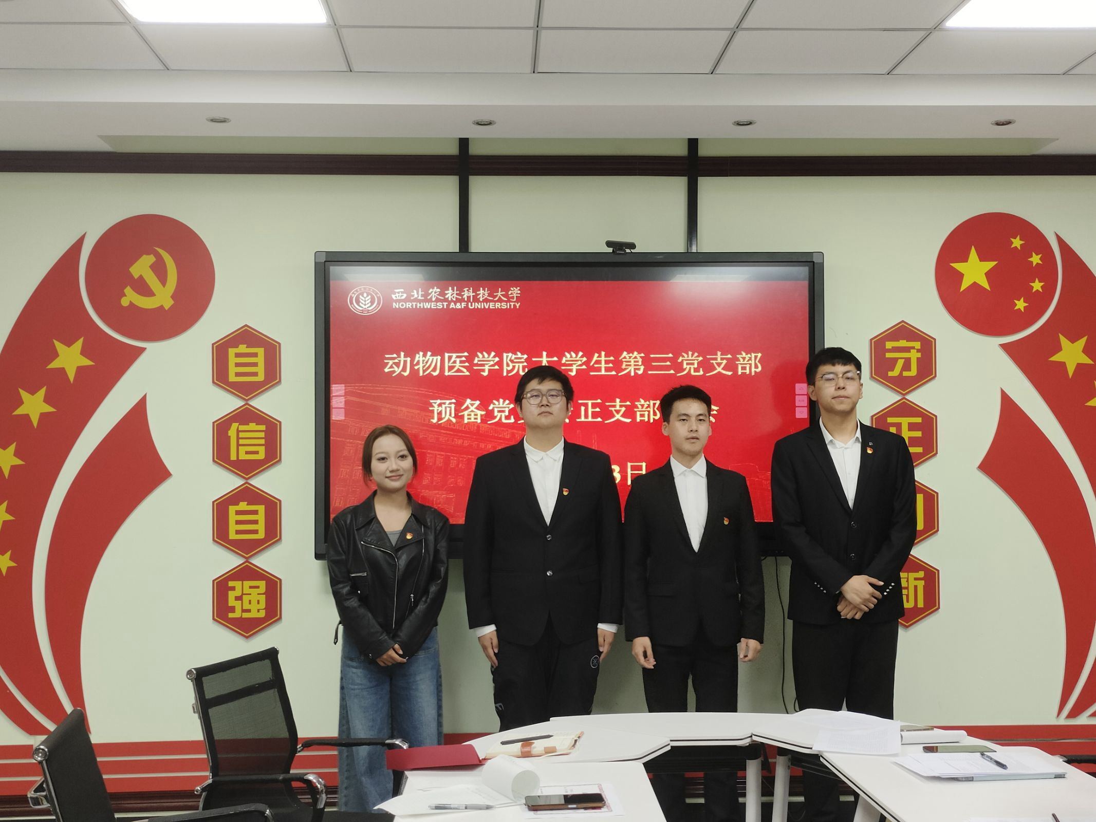 会议第二项议程,讨论中共预备党员任斌斌等三位同志预备期满按期转正相关事宜。在此之前,由李思瑶带领支部全体同志进行了庄严而神圣的入党宣誓。此后三位预备党员分别陈述自己的转正申请书,讲述自己在预备党员的一年期间的学习和收获,并由各自的入党介绍人汇报自己的观察结果。经支部大会讨论与正式党员无记名投票,与会党员一致同意任斌斌、宁致远、王宇轩三位中共预备党员按期转为中共正式党员。